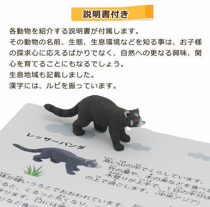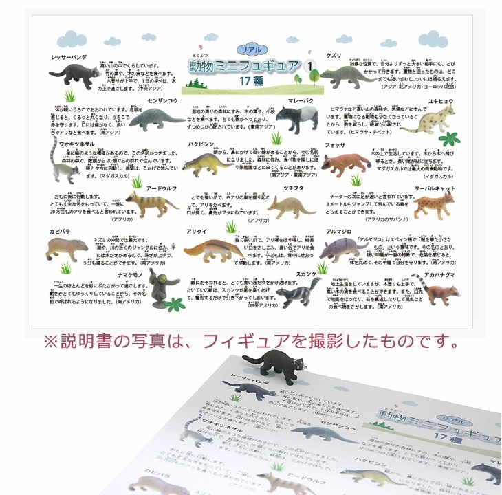 | フィギュアは、17種。小さいですが、特徴をよく捉えています。 説明文は、その動物の最も特徴的な事を書き、一覧表にしました。全体を捉えるのに役立つかと思います。 説明文の写真は、フィギュアを撮影したものなので、マッチングできますが、フィギュアの方がやや大きくなっています。 一覧表の上に、全フィギュアを乗せることができます。 説明書 420×298mm(A3) |