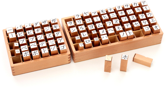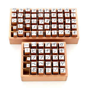 | 言葉の敏感期にいる幼児は、カタカナもひらがなと同様に学ぶことができます。年齢によっては、カタカナで表記すべき言葉(外来語、例えばテレビ、チョコレートなど・・・)も伝えてあげてもよいでしょう。 取り出したスタンプは元の箇所に戻すことをお約束にしましょう。また、誤っていたら、そっと直してあげて下さい。(自己訂正できる子は自分でしましょう) ゴム印の大きさは18×18oですからちょうど18oマスの国語ノートを使えます。 、や 。もありますから、文章を書くのにもお使いいただけけます。 マリーアンでは、この教具を楽しんでお使い頂くために、CDに収録した練習用紙をお付けします。CDですから必要なページを何枚でも印刷してお使い頂けます。どうぞご活用ください。 |