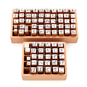 | 最近では、電子辞書や、インターネットが普及し、早く、面倒なく調べ物ができるようになりました。しかし便利な半面、残念なこともあります。 電子辞書は、情報量に於いて紙の辞書や、辞典に遠く及びません。また、紙の辞書辞典は、求める語句の説明が極めて詳細でわかりやすく、その語句の周辺にある情報(例えば類語解説、用例、など)は、非常に豊かで多岐、広範に渡っています。 辞書を引くということは、それらの情報にも触れる機会が多いということであり、そのことに因って興味が喚起され、自己学習が可能となり、やがては人格の形成にも繋がっていくでしょう。 しかしながら昨今は、この紙の辞書を引けない子どもが多くなっていると言われております。また、辞書が引けないどころか、「ひらがな50音」が満足に言えない、書けない子どもも珍しくないとのこと。 紙の辞書や、辞典が引けるようになるには「ひらがな50音」がしっかり頭の中に入っていなければなりません。例えば「む」で始まる語句を引くのに「あいう・・・」から唱えなければその音に辿りつかないとすると、時間もかかり、辞書引きは苦痛な作業になりかねません。 このスタンプは「ひらがな50音」を暗記する前に、或いは同時進行して、遊びのように使って無理なく「ひらがな50音」を身に付ける事ができます。 スタンプが仕切られた行と段にひとつずつ収められていることは、実に重要な意味があります。探すとき、そしてそれをまた元に戻すとき、「50音表」全体を捉えると共に、その音(文字)が全体からどの位置にあるのか感覚的にとらえる事ができるのです。それは、視覚を通して脳に記憶されるということでもあります。 取り出したスタンプは元の箇所に戻すことをお約束にしましょう。また、誤っていたら、そっと直してあげて下さい。(自己訂正できる子は自分でしましょう) ゴム印の大きさは18×18oですからちょうど18oマスの国語ノートを使えます。文章を書くのにもお使い下さい。 マリーアンでは、この教具を楽しんでお使い頂くために、CDに収録した練習用紙(全76ページ)をお付けします。CDですから必要なページを何枚でも印刷してお使い頂けます。どうぞご活用ください。 |