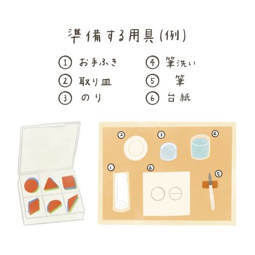 | 糊を使用するので、準備が必要です。 お盆に上のようにご用意ください。 タオルは、子どもの手に合うサイズー小さいタオル地のハンカチなど。 |