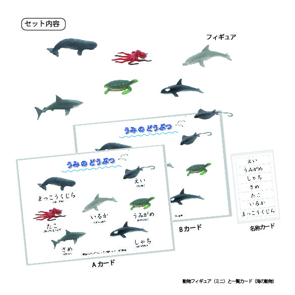 | 動物フィギュアは、7体。 マッコウクジラ、イルカ、サメ、タコ、エイ、ウミガメ、シャチ。 ノーブランドですが、それぞれの特徴がよく表現されています。 一覧カードの絵は、フィギュアを撮影したものです。 また、フィギュアとほぼ同じサイズなので、絵とフィギュアを重ねることができます。 文字はひらがな。 一覧カードと同サイズの名称カード付属します。 一覧カードと名称カードは、パウチラミネート加工しているので、長く使用でき、水拭きOK! 一覧カードサイズ 210×297o(A4) ※フィギュアは、小さいので、籠や、箱などに入れ「物と名前カード」の「おしごと」に使用できます。 |
